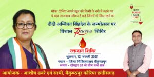 वहीं जिला कांग्रेस कमेटी के द्वारा जिला अस्पताल बैकुंठपुर में विशाल रक्तदान शिविर का आयोजन किया गया है। इस संबंध में जानकारी देते हुए कांग्रेस के जिला प्रवक्ता आशीष डवरे ने बताया कि 12 फरवरी शुक्रवार को दोपहर 1:00 से 3:00 बजे तक रक्तदान शिविर लगाया जा रहा है। जिसमें युवा कार्यकर्ताओं व अन्य लोगों के द्वारा रक्तदान किया जाएगा। उन्होंने अधिक से अधिक संख्या में रक्तदान कर इस कार्यक्रम को सफल बनाने का आग्रह किया है। बैकुंठपुर के बाद चरचा कॉलरी व पटना में आयोजित कार्यक्रम में संसदीय सचिव अम्बिका सिंहदेव शामिल होंगी।