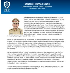 कोरिया एसपी संतोष सिंह का इंटरनेशनल आईएसीपी अवॉर्ड 2021 के लिये चयन…