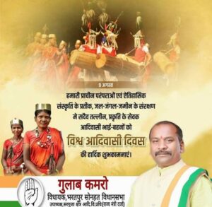 बैकुंठपुर/ आज 9 अगस्त को विश्व आदिवासी दिवस के मौके पर विभिन्न कार्यक्रमों व भव्य रैली का आयोजन प्रकृति के सरंक्षण व संवर्धन करने वाले सर्व आदिवासी समाज द्वारा किया गया है। जिला मुख्यालय बैकुंठपुर स्थित मानस भवन में जिला स्तरीय कार्यक्रम सविप्रा उपाध्यक्ष व विधायक गुलाब कमरो के मुख्य आतिथ्य में प्रातः 10 बजे से प्रारंभ होगा।